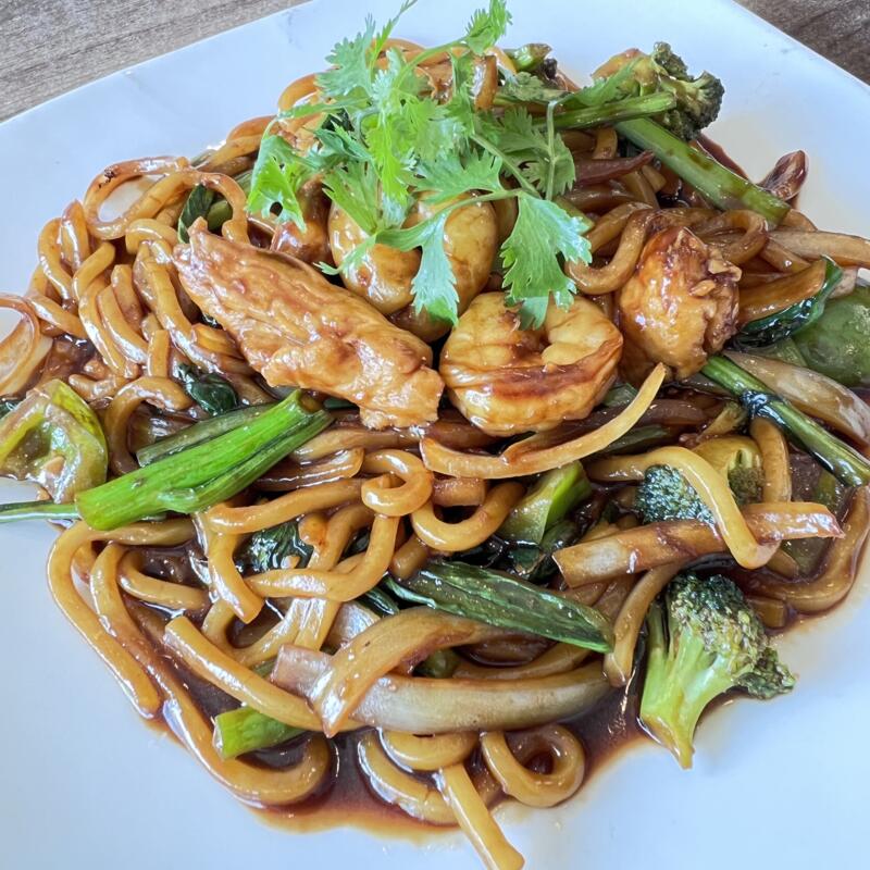 Udon noodles stir-fried with chicken, shrimps, and vegetables in a flavorful brown sauce.