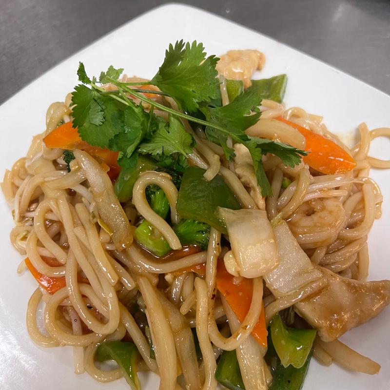 Japanese udon noodles stir-fried with chicken, shirmps, and vegetables in savory-sweet sauce.