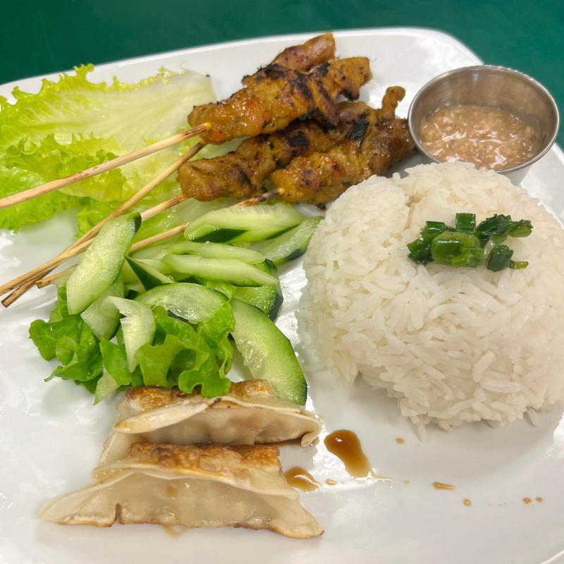 Four chicken satay skewers served with white rice, cucumber, two Gyoza, and peanut sauce.